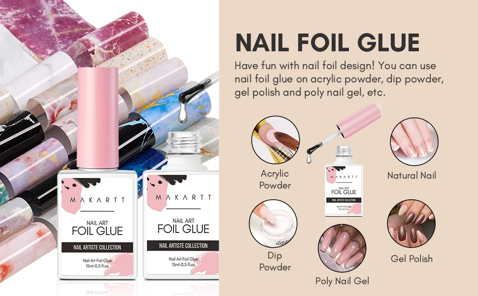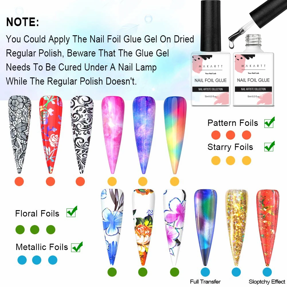 Perfect Nail Foil Art Kit: Makartt Foil Glue, help you easily and quickly transfer the foil sticker's pattern&great for both professional nail specialists or nail art beginner, suitable for nail salons and DIY nail art at home, wonderful offering for your wife, girlfriend, mother, and sisters.