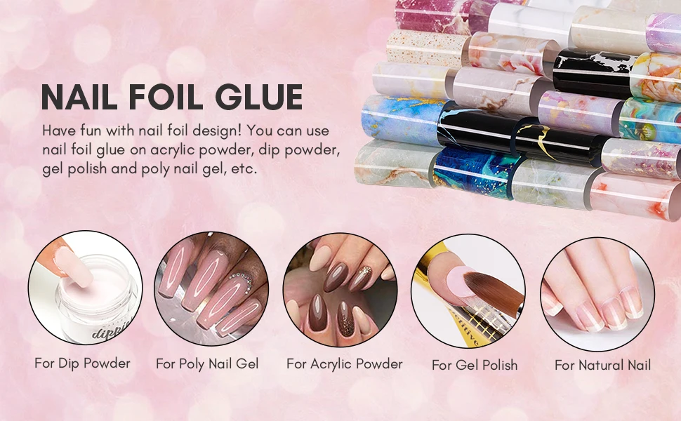 Great Value: Nail Art Foil Glue, perfect for professional nail salon, nail art School / College, nail artist use and nail lovers DIY Use At Home. It's suitable For Natural Nails, Gel Nails, Poly Nail Extension Gel, False Nails, Acrylic/Dip Nails, Nail Tips, Etc. And great for using the nail foil transfer glue with theme nail foil Stickers.