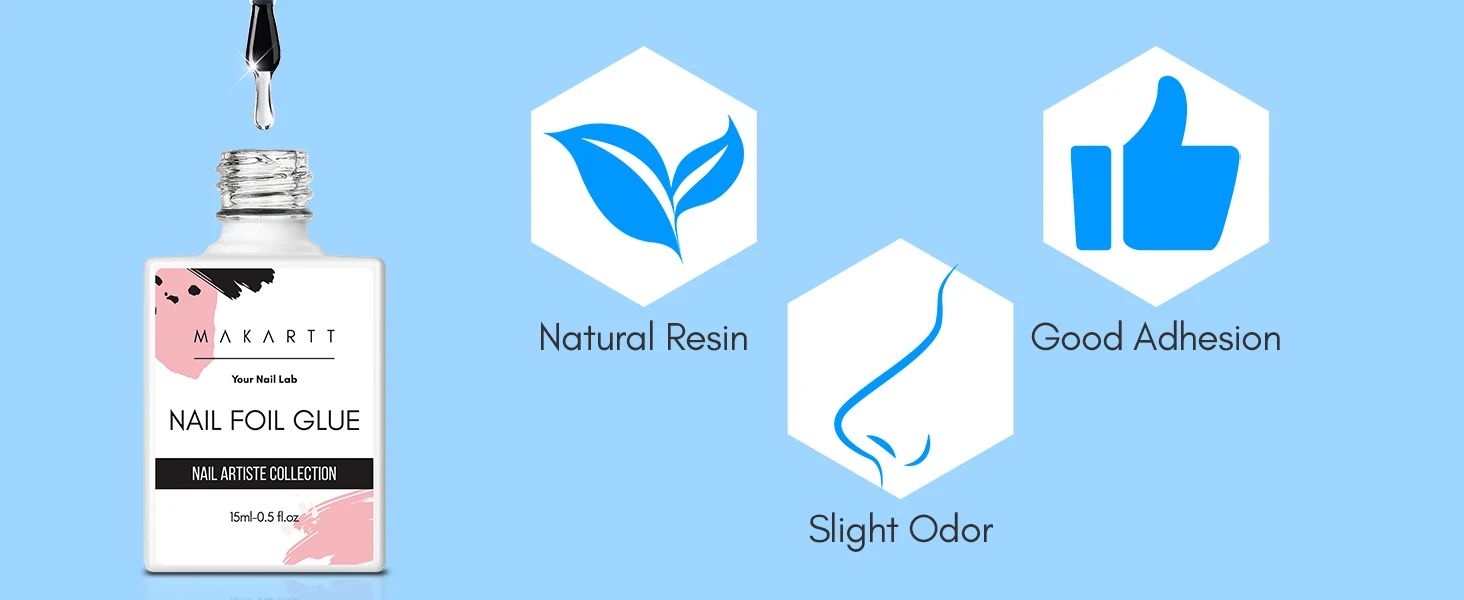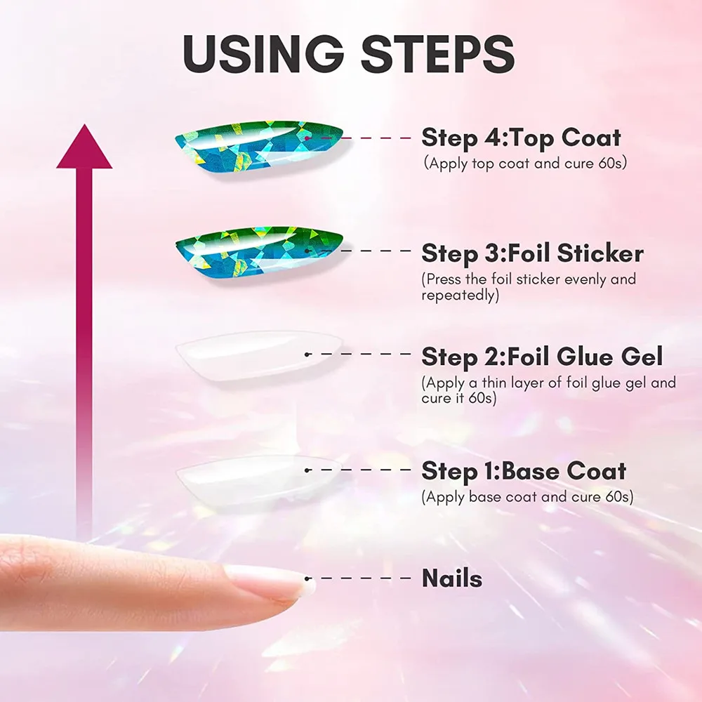 High-Quality Material Foil Glue: Our foil gel a is natural resin, slight odor, long lasting, strong adhesion, non-toxic , harmless to skin and nail. Avoid contact with eyes, mouth, and skin. Note: Stop using the product if redness and itching develop.