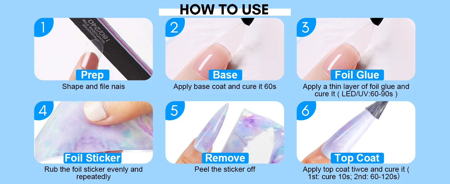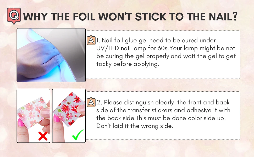 Easy to Apply & Remove: To apply: this transfer foil for nails should be cured under a nail lamp for a perfect foil result (60s), Using a enduring top coat can prolong the foil result in daily life. To Remove: easily with nail polish remover. Note: Please distinguish the Front and Back of Stickers.