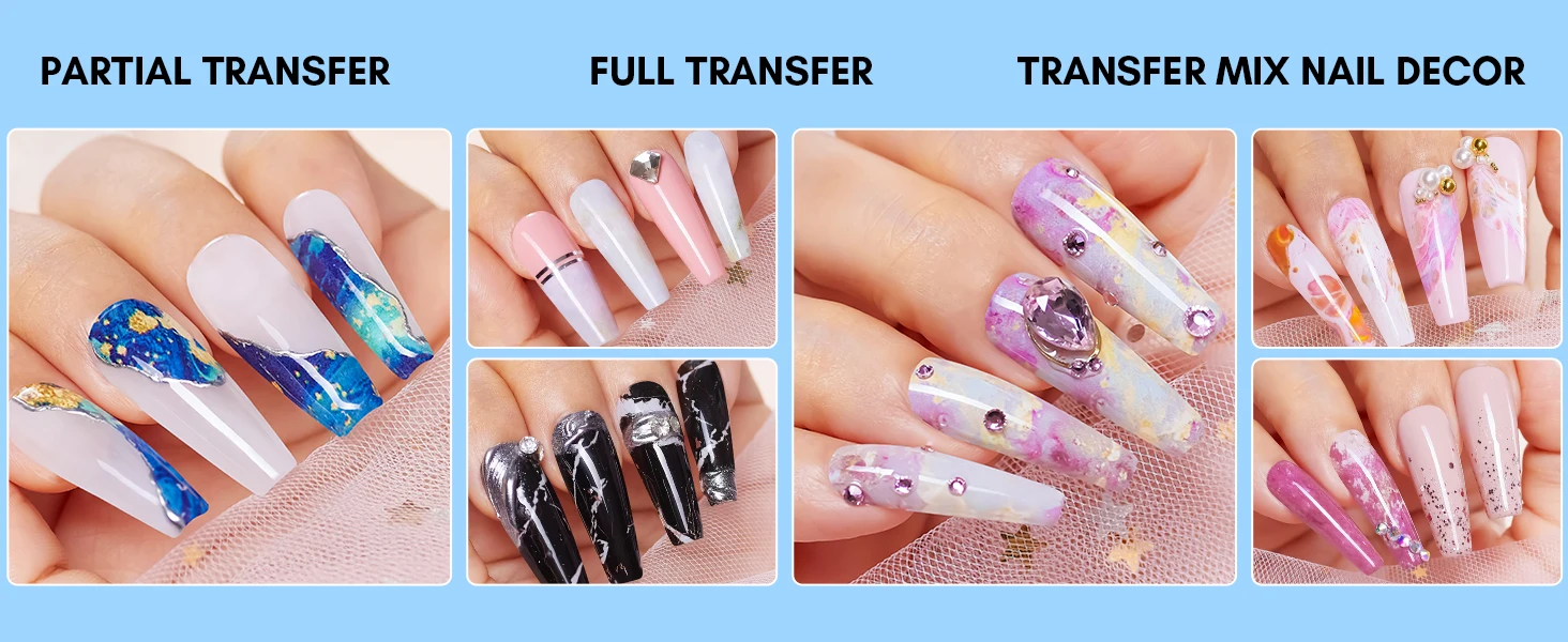 You can choose some of our colorful decoration sticker to DIY a mixed transfer , or apply other nail looking by mixing decorations such as glitters and gems , simply creating as much brilliant style as you think.